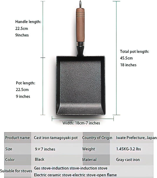 YYMIYU Tamagoyaki Japanese Omelette Pan Cast Iron Wooden Handle 9×7 inch