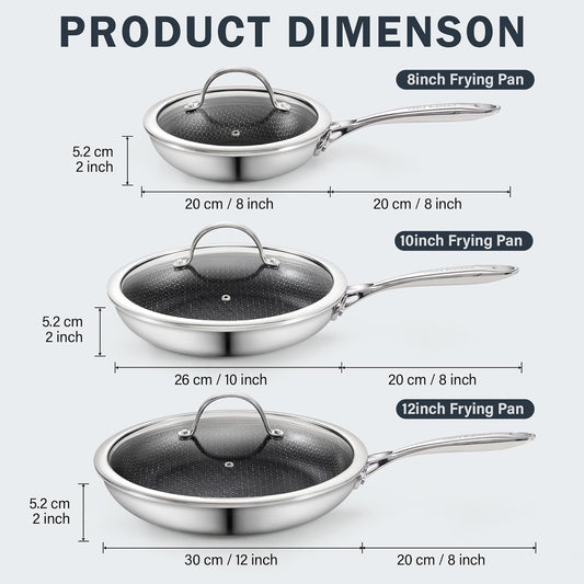 Cooks Standard Hybrid Nonstick Frying Pan Set, 8, 10 and 12-Inch Multi-Ply Clad Stainless Steel 3 Piece Skillet with Tempered Glass Lids, Oven Safe, Compatible with All Stovetops
