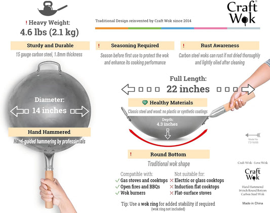 Craft Wok Traditional Hand Hammered Chinese Carbon Steel Wok with Wooden and Steel Helper Handle (14 Inch, Round Bottom Pow Wok Pan) / 731W88