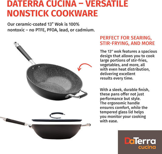 DaTerra Cucina - 13" Nonstick Ceramic Wok with Lid - Made in Italy - High Heat Resistant Nonstick Cookware - Oven Safe, PTFE, Cadmium, Lead & PFOA free - Volcanic Black Speckled