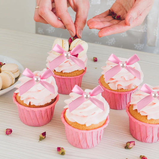 xo, Fetti Mini Pink Bow + Pearl Cake Toppers | 12 pcs | Bachelorette Party Decoration, Birthday Candle Accessory, Engagement Dessert Decor, Bridal Food Supplies