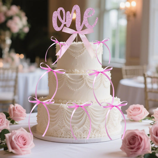 ALISSAR 1st Birthday Cake Topper with 8 Pink Bows – First Birthday Cake Decorations for Girls, Pink Bow, One Cake Topper for 1st Birthday Party