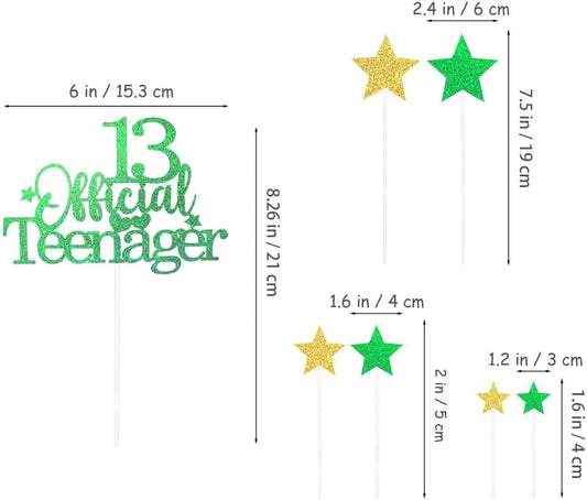 Glittery 13 Ofiicial Teenager Cake Topper with Star,13th Happy Birthday Cake Topper Party Decorations Party Supplies for Boys Girls Green Gold