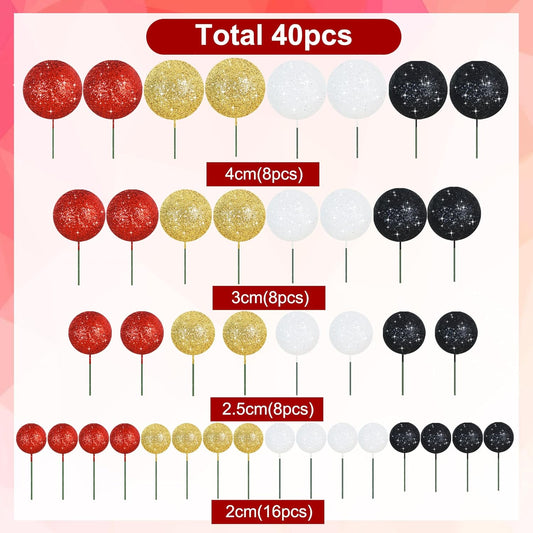 BEISHIDA 40 Pcs Foam Ball Cake Toppers with Sticks Mini Cake Decorations for Birthdays, Weddings, Baby Showers, DIY Baking Supplies, Anniversary Party (Red, Black, White,Gold)