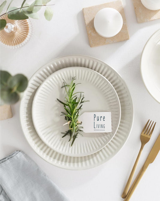 Stoneware Dinnerware Set for 8 People HYGGE 24-Piece - Elegant Scandi Design - Premium Dish Set - Bowl and Plate Set - Tableware for 8 People in a Ribbed Design - Pure Living in White