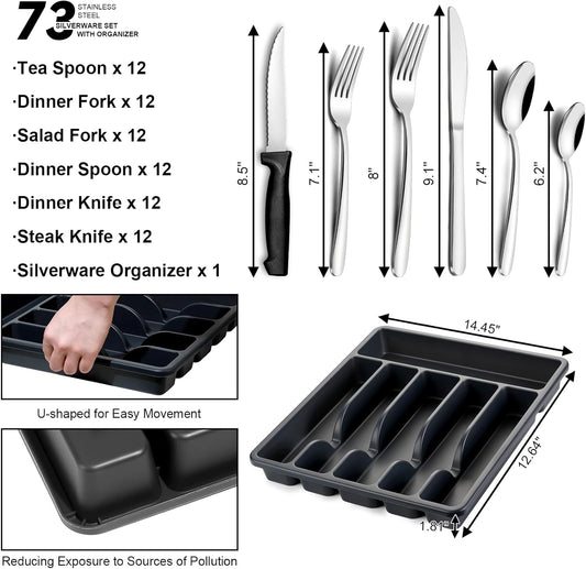 Pleafind 73-Piece Silverware Set with Organizer, Stainless Steel Silverware Sets for 12, Cutlery Utensil Sets with Steak Knives, Include Forks Spoons Knives & Silverware Organizer, Dishwasher Safe