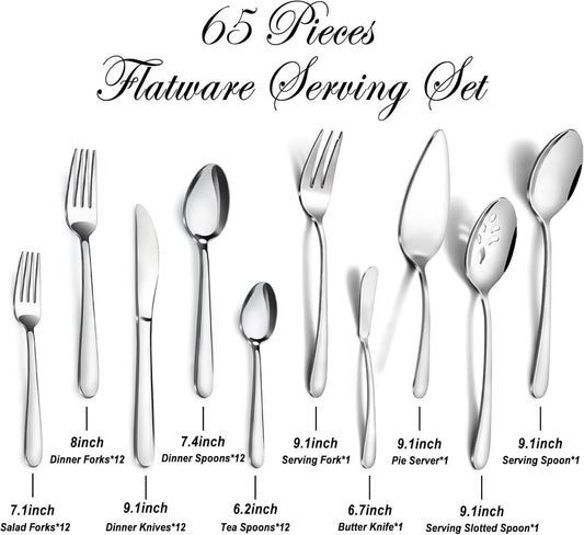 Pleafind 65-Pieces Silverware Set for 12 with 5 Serving Utensils,Stainless Steel Cutlery Set, Include Forks Spoons and Knives Set, Mirror Polished Utensil Sets for Home Restaurant,Dishwasher Safe