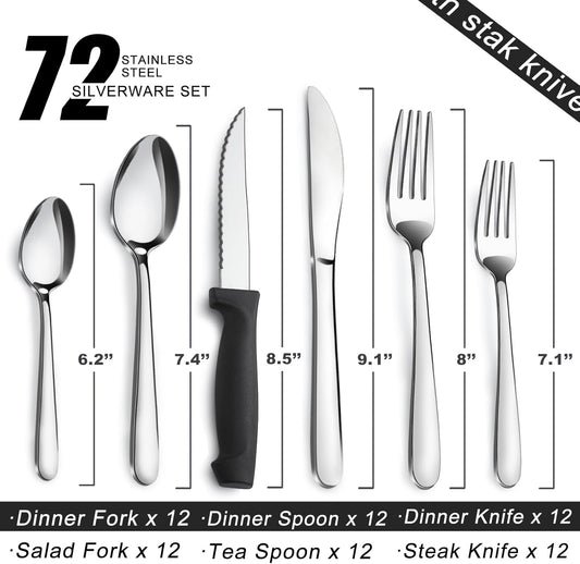 Pleafind 72-Pieces Silverware Set for 12, Flatware Set with Steak Knives, Stainless Steel Cutlery Set, Include Forks Spoons and Knives Set, Dishwasher Safe Utensil Sets for Home Restaurant