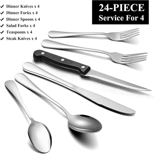 Pleafind 24-Piece Silverware Set - Stainless Steel Flatware with Steak Knives, Forks, Spoons, Knives - Dishwasher Safe for Home or Restaurant