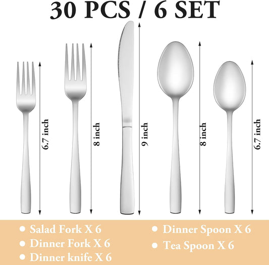 30 Piece Silverware Set Service for 6,Premium Stainless Steel Flatware Set,Mirror Polished Cutlery Utensil Set,Durable Home Kitchen Eating Tableware Set,Include Fork Knife Spoon Set,Dishwasher Safe