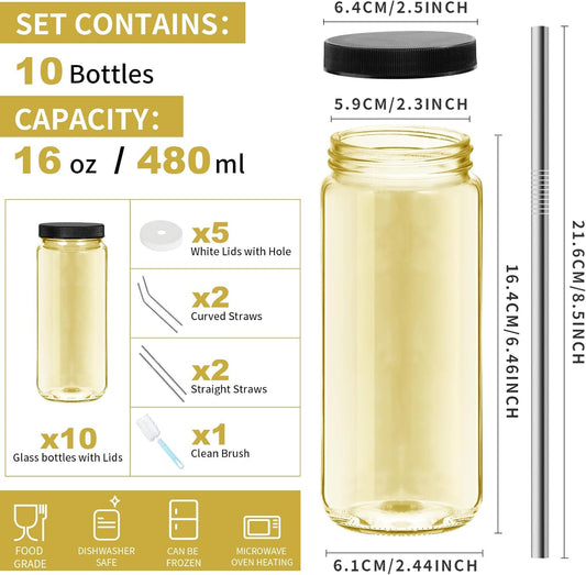Ruckae 16oz 10 Pack Juice Bottles, Glass Bottles with Lids, Smoothie Cup Lids and Straws, Water Bottle Mason Jar Drinking Glasses for Juicing, Smoothies, Kombucha