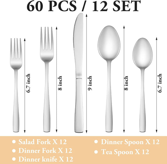 60 Piece Silverware Set Service for 12,Premium Stainless Steel Flatware Set,Mirror Polished Cutlery Utensil Sets,Durable Home Kitchen Eating Tableware Sets,Include Fork Knife Spoon,Dishwasher Safe