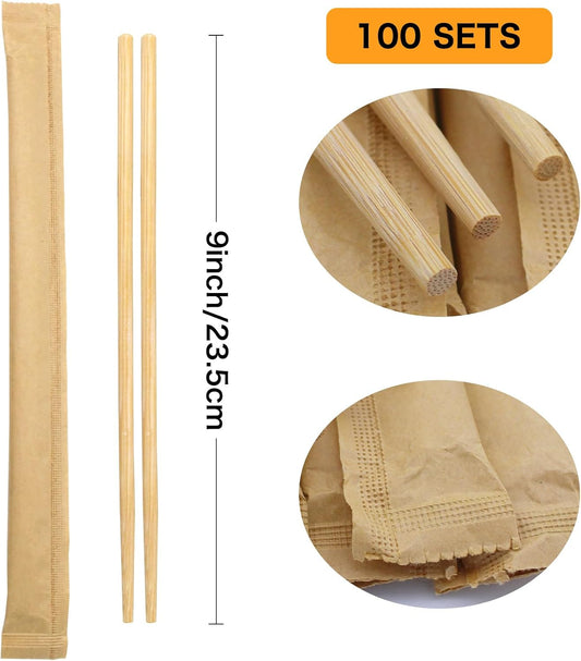 52USA Disposable Bamboo Chopsticks (100 Sets), 9'' Long Individually Wrapped Chinese Chopsticks Wooden Clear Bag Bulk