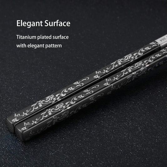 Stainless Steel Chopsticks Titanium Plated Metal Chopsticks Reusable Dishwasher safe Premium Japanese Korean Chopstick Laser Engraved Anti-slip Chop Sticks for Eating 2 Pairs Gift Set Black Silver