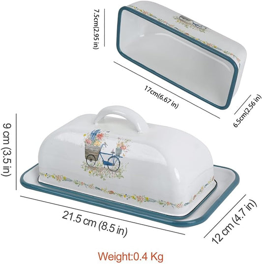 Enamel Butter Dish with Lid Vintage Enamelware Butter Holder with Flower Design Farmhouse Butter Container Butter Storage with Tray for Countertop Kitchen Decor