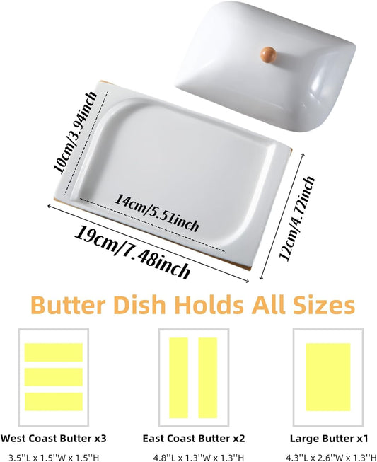 Butter Dish with Lid and Knife Ceramic Butter Holder for Counter Humanized Clamp-able Knife Handle Design, Perfect for East West Coast Butter, White