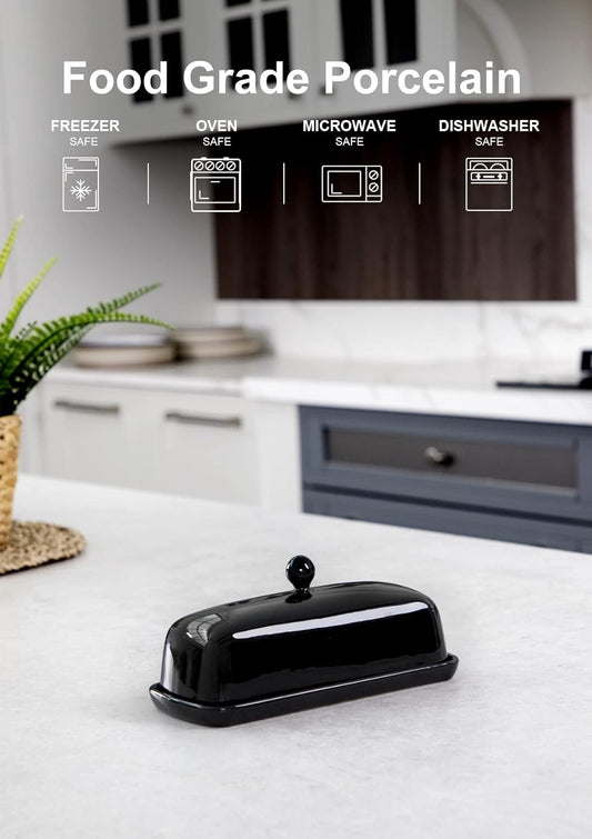 Ceramic Butter Dish Set with Lid and Knife - [Black]- Decorative Butter Stick Holder with Handle for 1 Stick of Butter - Microwave Safe, Dishwasher Safe - Anti-Scratch Stickers Included.