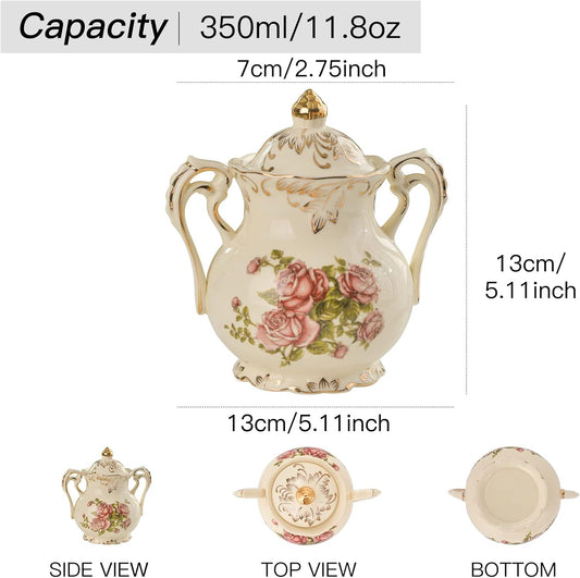 YOLIFE Ceramic Sugar and Creamer Set, Vintage Porlcelain Pitcher Creamer Sugar Bowl with Lid, Pink Rose Floarl Golden Leaves Edge