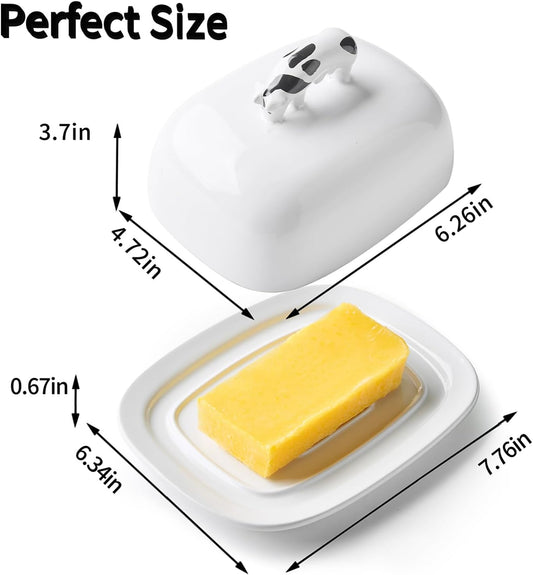 Butter Dish with Lid for Countertop, 7.8" x 6.3" Large Ceramic Butter Keeper Container with Cow Handle, White Butter Holder Tray for East West Coast Butter Stick, Microwave & Dishwasher Safe