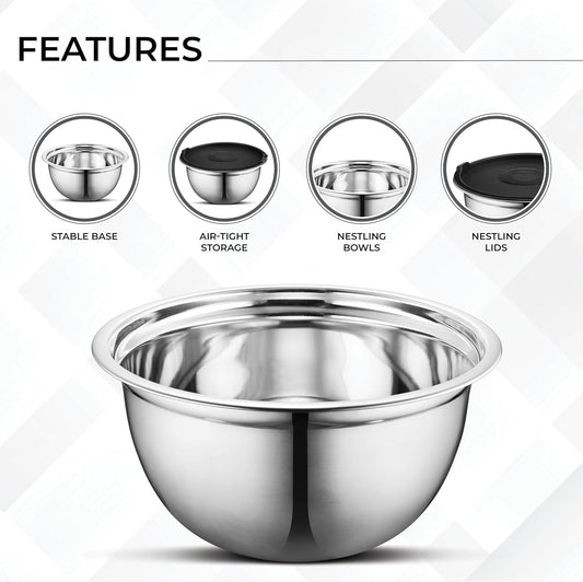 AVADOR Premium Stainless Steel Mixing Bowls Sets Brushed Stainless Steel Mixing Bowl Set, Easy To Clean, Space Saving, Great for Cooking, Baking, Prepping Needs (9 pc Anti Slip with Lid and Graters)