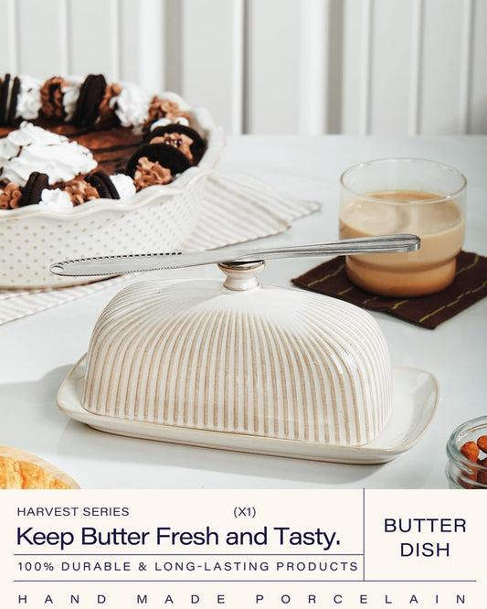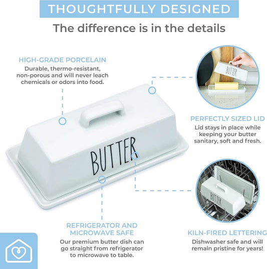 Heartland Home Porcelain Covered Butter Dish with Lid for Countertop (Lid with Handle). 7.6" x 3.8" Butter Holder Container for One Stick of Butter. Textured Tray Butter Keeper for Non Slip Storage