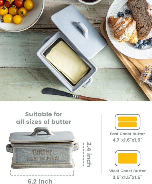 Butter Dish with Lid, Ceramic Butter Holder Container Large Butter Dish for Countertop Farmhouse Decor Butter Keeper for East West Coast Butter, Gray