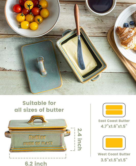 Butter Dish with Lid, Ceramic Butter Holder Container Large Butter Dish for Countertop Farmhouse Decor Butter Keeper for East West Coast Butter, Green