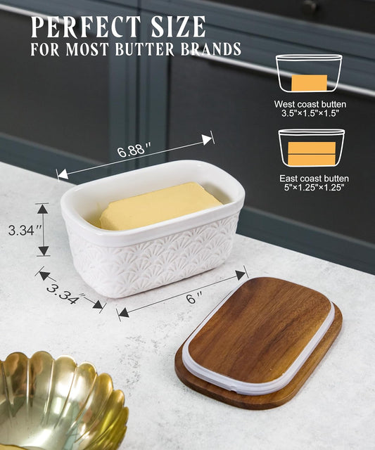 Nucookery Ceramic Butter Dish, Embossed Butter Keeper with Wood Lid for Countertop, Butter Holder and Container with Double Silicone Seal, Woven Pattern