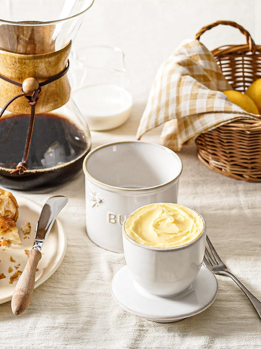 LE TAUCI Butter Crock, Butter Dish with Lid, Butter Container for Counter with Water Line, Embossed French Butter Keeper for Spreadable Butter, Suit For Housewarming - Set of 1, Arctic White, Bee