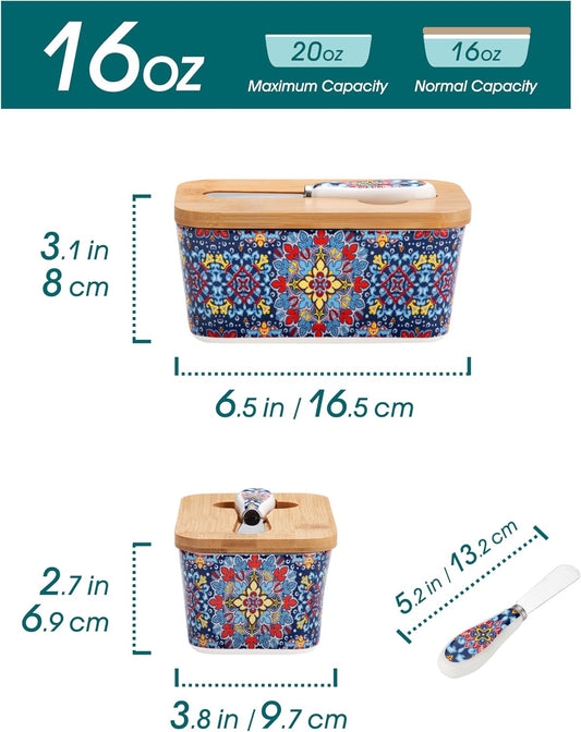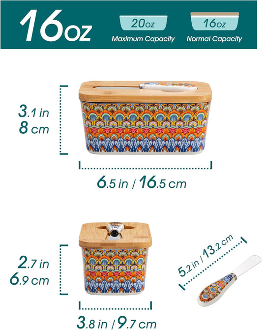 vancasso SIMI Butter Dish with Lid, 6.5" Large Butter Dish for Countertop, Bohemian Ceramic Butter Keeper Container with Knife and Bamboo Lid, Butter Holder for Counter, Regal Bloom