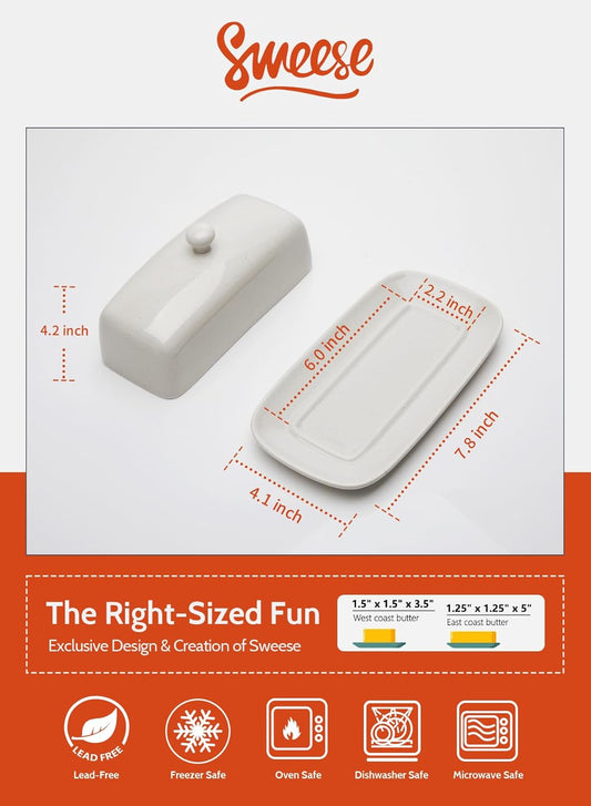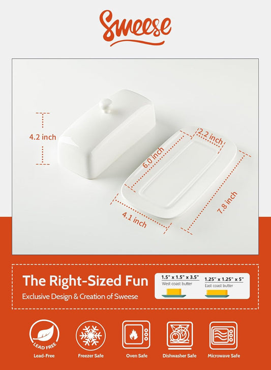 Sweese Butter Dish with Lid, Porcelain Butter Keeper, 7.8 Inch Butter Holder with Handle Cover, Butter Container Perfect for East West Coast Butter, White
