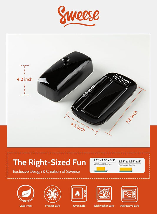 Sweese Butter Dish with Lid, Porcelain Butter Keeper, 7.8 Inch Butter Holder with Handle Cover, Butter Container Perfect for East West Coast Butter, Black