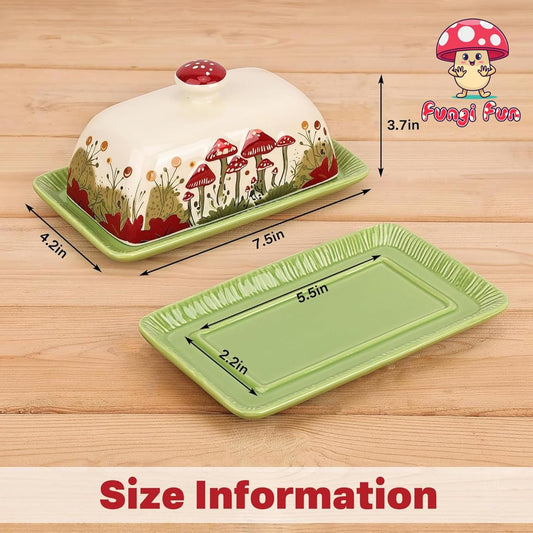 Fungi Fun Mushroom Butter Dish With Lid For Countertop Ceramic Butterdish, Red Mushroom Butter Container, Butter Tray Large Butter Dish Covered (Dark Green, Standard)