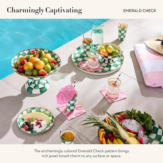 MACKENZIE-CHILDS Enamel Round Tray, Unique Serving Platter for Food and Drinks, Green-and-White Emerald Check