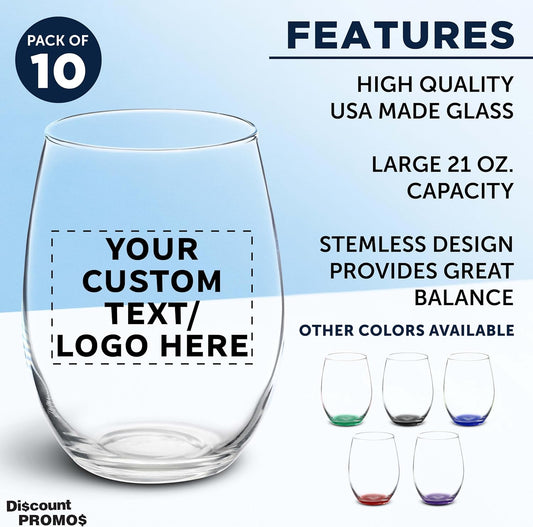 DISCOUNT PROMOS 10 ARC Stemless Wine Glasses Set, 21 oz. - Customizable Text, Logo - Chardonnay, Cabernet, Merlot, Sauvignon - Clear