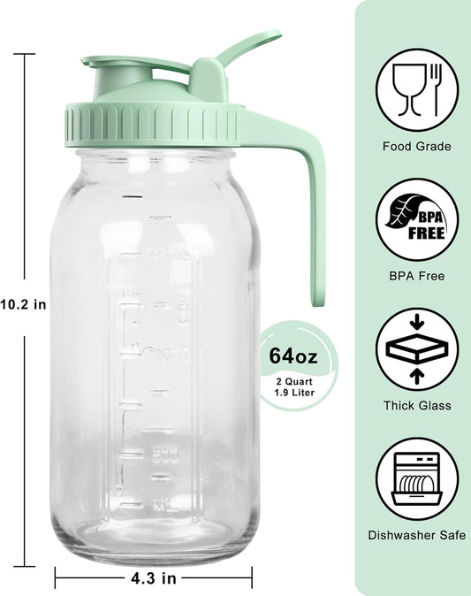 64oz Glass Breast Milk Pitcher with Lid & Pour Spout, 2 Quart Airtight Leakproof BreastMilk Fridge Storage Container - Wide Mouth, Dishwasher Safe Formula Pitcher with Handle