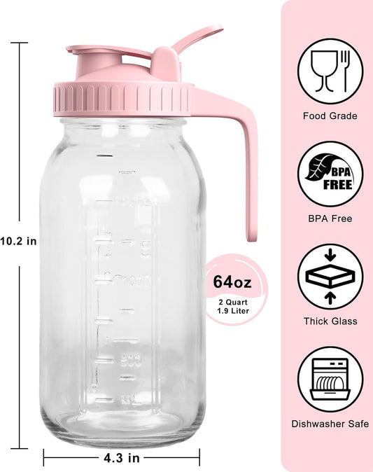 64oz Glass Mason Jar Pitcher with Lid and Spout, 2 Quart Airtight Glass Water Jug, Leakproof Wide Mouth Mason Jar Pitcher for Iced Sun Tea, Milk Storage, Cold Brew Coffee, Juice, Pink