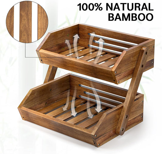 G.a HOMEFAVOR Fruit Basket: 2-Tier Acacia Wood Fruit Bowl for Kitchen, Fruit Stand Storage Holder for Vegetables and Snack Home Kitchen Countertop Organizer (Self-assembly)