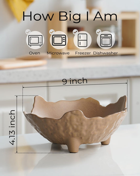 Fruit Bowl for Kitchen Counter, Porcelain Decorative Bowl for Home Décor Modern Pedestal Bowl with 3-Legs Large Centerpiece Bowl for Breads, Nuts, Brown