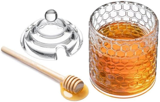 Royalty Art Glass Honey Pot with Beehive Lid and Wooden Dipper, 3 Pc. Set, Decorative Kitchen Accessory and Dispenser, Honeycomb Glassware, Reusable and Washable
