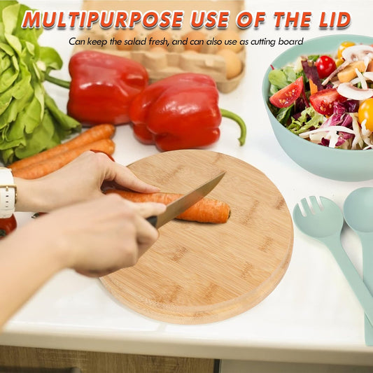 ShineMe Large Salad Bowl with Lid, Salad Serving Bowl Set with Utensils, 9.8inches Mixing Bowl with Servers, Solid Bamboo Wooden Bowl for Salad, Fruits, Vegetables and Pasta(elegant green)