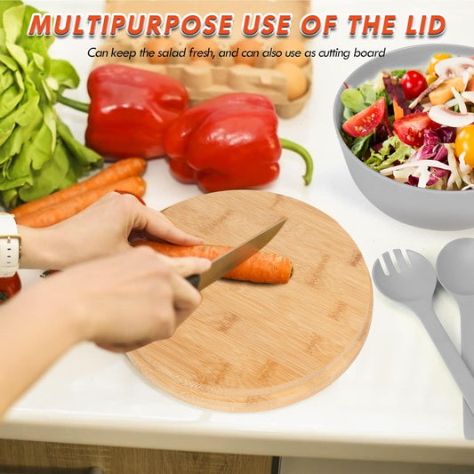 Large Salad Bowl with Lid, Bamboo Fiber Salad Serving Bowl Set with Utensils, 9.8inches Mixing Bowl with Servers, Solid Bamboo Wooden Bowl for Salad, Fruits, Vegetables and Pasta(Gray)
