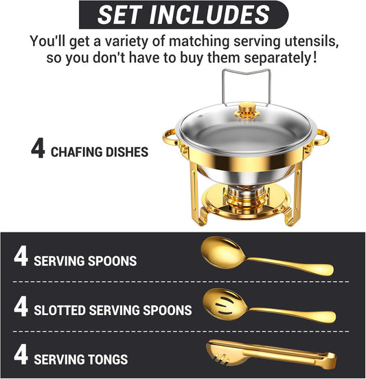 Chafing Dishes for Buffet, 4 Pack 5QT Round Stainless Steel Chafing Dish Set for Home Parties, Christmas Gatherings, Catering Events Complete Buffet Warmer Set (Golden 4)