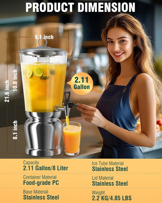 WantJoin Beverage Dispenser With Stand, Drink Dispenser for Party, Stainless Steel Water Dispenser with Ice Core, Spigot, Drink Jar Jug For Home Parties Lemonade, Clear Acrylic, 2-GALLONS 8 Liters