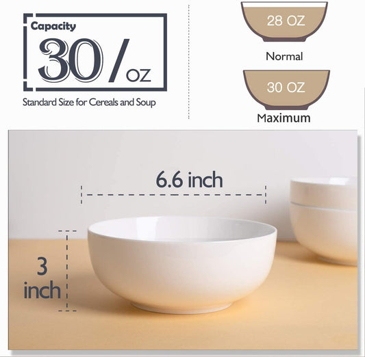 DELLING 30 OZ Ceramic Soup Bowls Set of 6 - Large White Serving Bowls for Kitchen, Pasta, Salad, Rice, Oatmeal, Microwave Safe