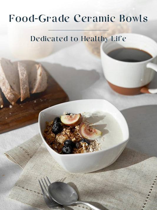 DOWAN Porcelain Soup Bowls Set of 6, 27 OZ Ceramic Square Cereal Bowls, White Bowl, for Ice Cream and Dessert Snack, Wedding Party Gift, Microwave Safe Bowl