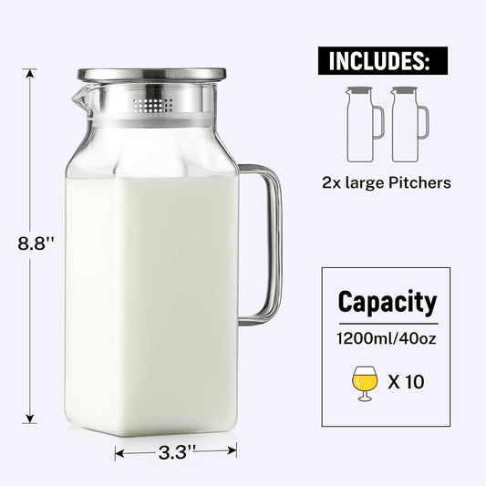 Netany 2 Pack 1.2 Liters/40 oz Small Square Glass Pitcher with Lid and Handle for Fridge, Iced Tea and Coffee Carafe Storage Container, Resistant to Hot and Cold Borosilicate Jug