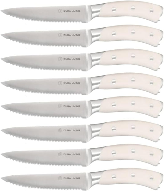 8-Piece Serrated Kitchen Steak Knife Set – Forged High Carbon Stainless Steel, Ultra Sharp, Ergonomic Black Handles, Durable Dinner Knives, Cream Handle