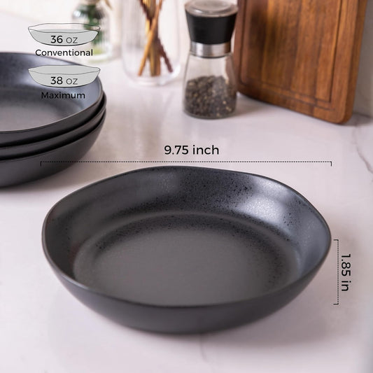 AmorArc Ceramic 9.75 inch Large Flat Pasta Bowls, 38oz Wide Bowls Set of 4 for Kitchen, Oven,Microwave&Dishwasher Safe Bowls with Wavy Rim for Pasta Salad Dinner, Speckled Black