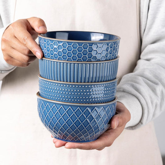 GBHOME Stoneware Cereal Bowls Set of 4, 24 oz Ceramic Soup Bowls with Texture Patterns for Soup,Oatmeal,Snack Perfect for Wedding, House-warming Gift - Moonlight Blue